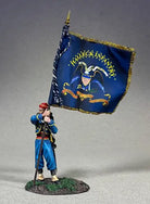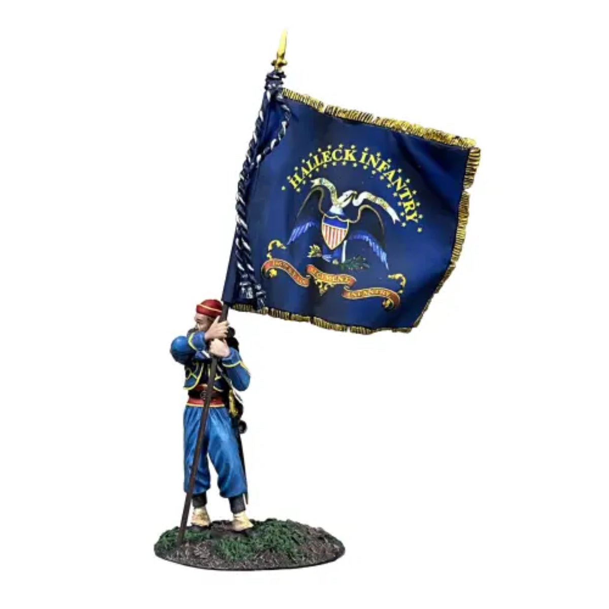 The 146th New York Infantry Regiment, nicknamed Garrard’s Tigers, was a Federal regiment mustered into service October 10th, 1862. The regiment was raised and organized in Rome, New York and was known as the 5th Oneida Regiment. Another nickname, and more widely known by civil war historians, was Halleck’s Infantry, after New York born Major General Henry Halleck. You will notice Gen Halleck’s name on this figure’s flag. At first the regiment wore the regular dark blue Federal state jacket, light blue trousers, and standard forage cap. In June of 1863 the regiment switched, changing their uniforms to the colorful zouave dress. This new uniform was not actually zouave, but rather the colorful dress of French-Turco style with the most distinctive features being the sky blue zouave jacket with yellow trimming, a red fez with yellow tassel, sky blue trousers with red sash.