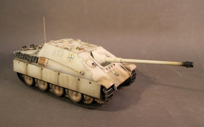 This model represents a Jagdpanther Ausf G2 of the 2. SS-Panzer Division "Das Reich". Late in the war, German industry could not keep pace with the tremendous losses of armor suffered by the Wehrmacht during the Battle of France, Operation Bagration on the Eastern Front, and the Battle of the Bulge. Consequently, tank destroyers like the Jagdpanther and Hetzer were often issued instead of tanks to Panzer Divisions late in the war. Das Reich was issued Jagpanthers in early February 1945 while it was refitting following the Battle of the Bulge. It used them in the 8. Kompanie of its Panzer Regiment during Operation "Spring Awakening", the last major panzer offensive of the war around Lake Balaton in Hungary. Das Reich continued to employ Jagdpanthers on the Eastern Front until its eventual surrender to the U.S. Army in May of 1945.