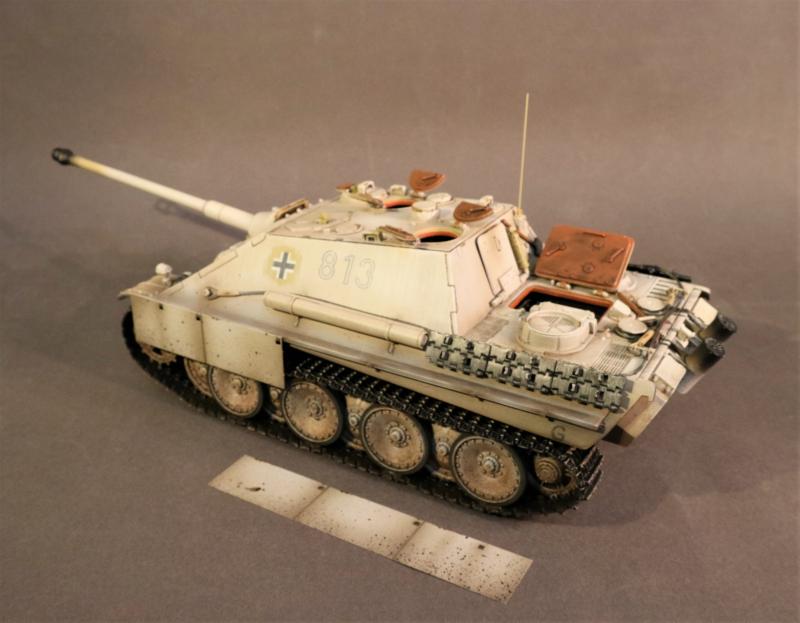The Das Reich Jagdpanther Ausf G2 comes in winter whitewash with a primer red interior and displays many late production modifications including a raised crew compartment heater over the left engine cooling exhaust fan, sliding plates over the right-side air intakes to regulate radiator temperatures, and flame suppressing exhausts (Flammenvernichter). Its markings also include a stylized "G" on the front glacis plate and rear hull sides. This marking was evident on many Jagdpanthers and other panzers during this time frame and meant the vehicle had been treated with the winter antifreeze solution Glysantin. Prominently displayed, the Glysantin "G" alerted crews not to add the summer coolant Akorol, lest catastrophic engine damage occur.
