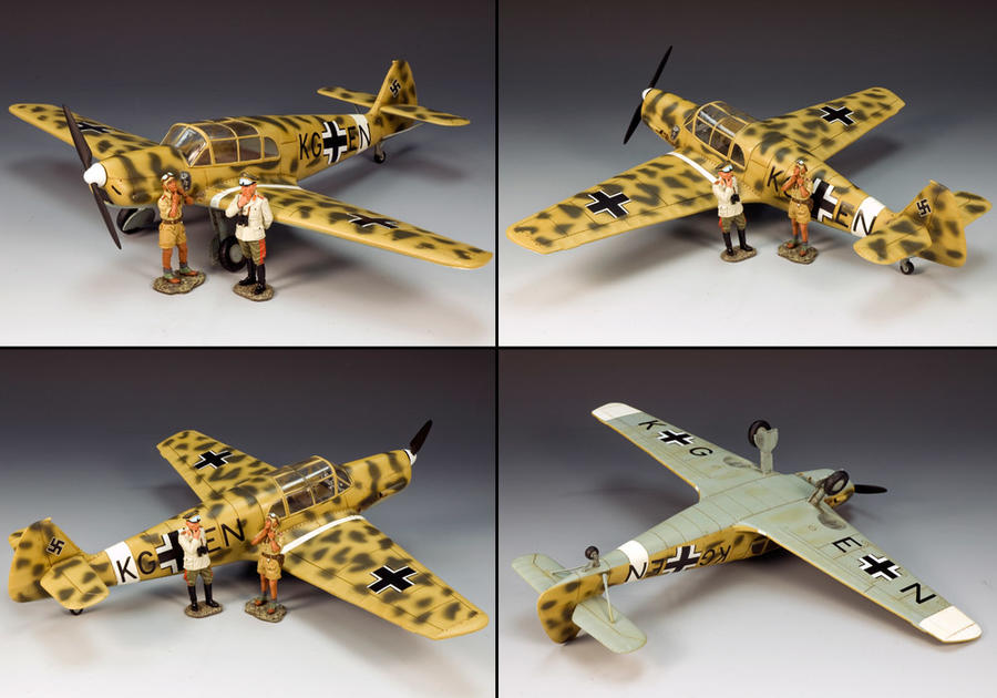 During the war in North Africa, Erwin Rommel believed in being in as many places as he could, in meeting as many of his men and commanders as possible and seeing for himself what the situation was really like… either in or behind the frontline. He made ample use of the Luftwaffe's resources to get him all over the battlefield and his command. Among his most useful Desert Taxis", as he often referred to them, was the Messerschmitt 108 "Taifun". Designed and developed in the 1930's by Willy Messerschmitt this little 4-seater was the fore runner of the world-famous Me.109 fighter. Our Afrika Korps versions is in typical worn and weathered Luftwaffe tropical paint scheme of dark mottle over sand colour. Through the clear canopy you can see a fully detailed cockpit. Outside stand Rommel's personal pilot and a brand-new portrait study of the great Field Marshall himself. "