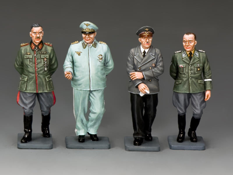 The Führer, clutching a badly bruised right arm walks together with Field Marshal Keitel, Luftwaffe Chief Hermann Goring and Head of the Reich Chancellery Martin Bormann on their way to see the wounded officers. A handful of photos survive of this short walk which proved to Germany and the world that Hitler had, once again survived a deadly attack. Our 4-figure set is based on one of the photos.