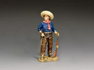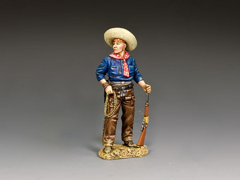 This standing Vaquero holds a rope in one hand and a ‘Winchester’ repeating rifle in the other. This particular vaquero may even be a ‘Tejano’... A Texas – born cowboy / vaquero of Mexican parentage. He’s wearing a store-bought work shirt and locally-made leather ‘chaps’, with of course the large ‘bandanna’ and the very practical sombrero.