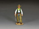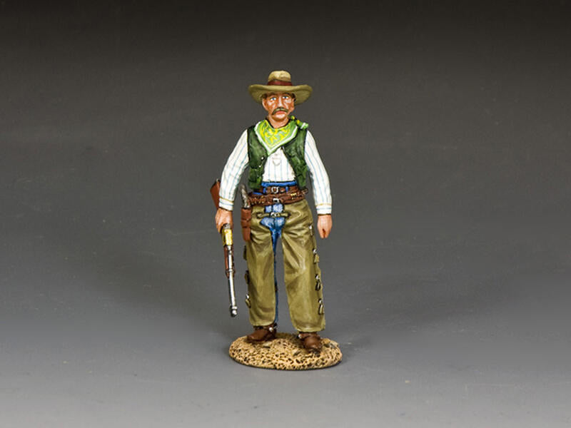 This cowboy is holding his treasured ‘Winchester Model 1873 Lever-Action Rifle’. This is the weapon that became known as ‘The Gun that won the West’ and it came with two timeless features: reliability and firepower. In an era when many other rifles and pistols were fussy and unreliable the ’73 was the weapon that would never let you down. It could hold 15 rounds in a tubular magazine beneath the barrel and fired a .44/40 calibre round. This was further enhanced when Remington and Colt began chambering their own revolvers to carry the same .44/40 rounds meaning cowboys used the same ammunition for both rifle and pistol. Among the famous Western characters that carried the Winchester ’73 were Buffalo Bill (William F. Cody), the outlaws Jesse and Frank James and the Apache leader Geronimo. In addition modern ballistic experts have revealed that at least 8 different Winchester ‘73s were used by Indians at the Battle of the Little Bighorn in 1876!