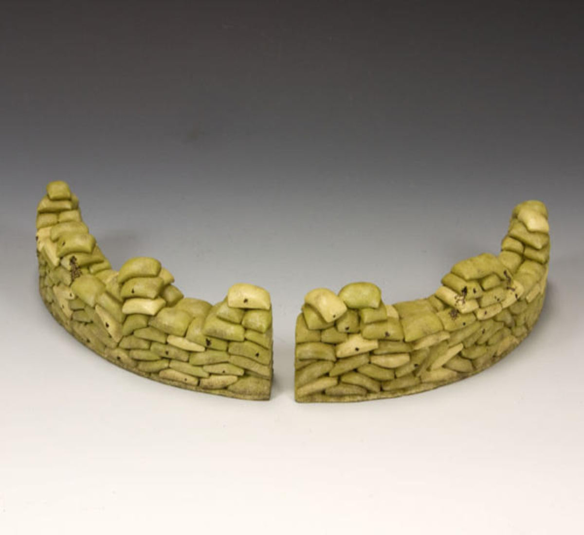 Two curved, adjoining sections of double sand-bagged wall that can accommodate an artillery gun, a command post or a parked fighting vehicle or tank.