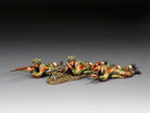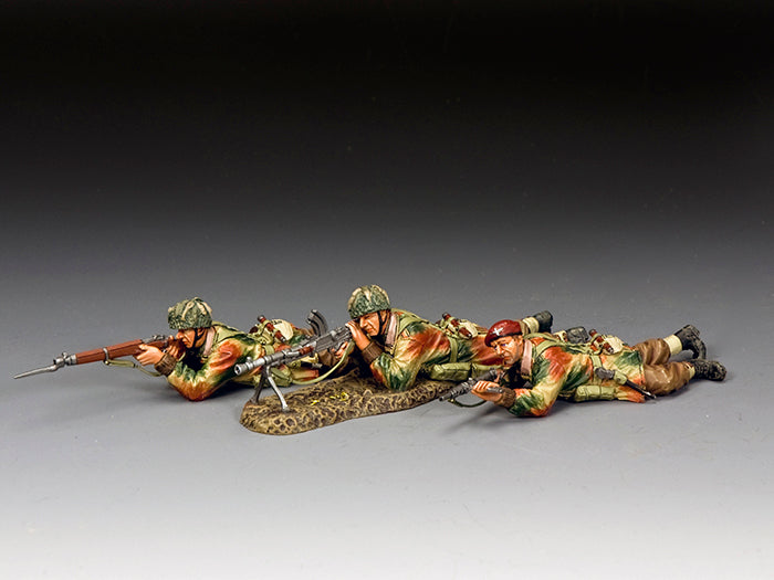 Three lying prone British paratroopers... In the centre lies the ‘Bren Gunner’ flanked on either side by another Para with the Lee Enfield rifle and one more with the Sten Gun. Perfect for any collector making a defensive position.