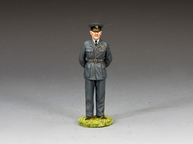 Sir Hugh Dowding (1882-1970) was the Air Officer Commanding RAF Fighter Command before and during The Battle of Britain. He is credited with playing the crucial role in Britain’s air defence, and hence, the ultimate defeat of Hitler’s plan to invade Britain in the autumn of 1940. Thanks to his prudent management of scarce Spitfires and Hurricanes the Royal Air Force managed to inflict heavy casualties on the German Luftwaffe’s more numerous bombers and fighters attacking Britain from nearby France and Belgium and distant Norway. This K&C figure, our second of Sir Hugh, shows him in service dress about to meet some of his young fighter pilots.