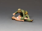 As a gravely-wounded Marine awaits evacuation a Navy Corpsman gives him a sip of water. Navy Corpsman during WW2 were enlisted medical specialists of the U.S. Navy who also served with U.S. Marine Corps units. Their bravery under fire was legendary and in WW2 alone they won no less than 7 Medals of Honor.