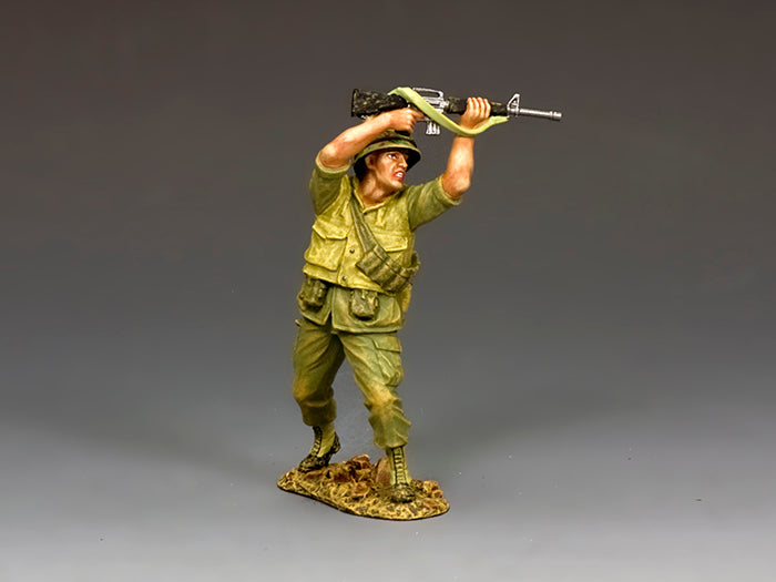 Not wishing to expose himself to the enemy this Marine raises his M16 over his head and opens fire on ‘fully automatic’. Although frowned upon as a waste of ammo... in a tight situation you did what you had to do to make the enemy keep their heads down and perhaps allow your buddies to advance or even fall back to safety.
