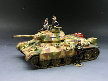 The Germans quickly decided to use them and, in some cases, made improvements on the Russian design. Our model, WS098, boasts German-style sideskirt protection as well as a Panzer III/IV topturret hatch, three-colour camouflage and a Nazi recognition flag. Three German tank crew accompany the vehicle.