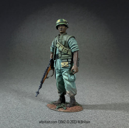 The United States Marine Corps’ foray in Vietnam began on 2 August 1954 in an advisory capacity. Following 1964’s Gulf of Tonkin incident, their relationship with Southeast Asia changed considerably. This Marine carries the M14 rifle used during the earlier stage of the war. The M14 became the standard battle rifle for the U.S. Military in 1957 replacing the M1 Garand of World War II and Korea (the U.S.M.C. would adopt it in 1965). The rifle was of similar construction to the M1 but chambered for the .308 round with magazine extension. It had a loud report and a lot of hitting power but proved too heavy and cumbersome for the jungle environment and would be replaced in 1967 by the M16 assault rifle.