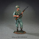22 February 1965, General W.C. Westmoreland, Commander, U.S. Military Assistance Command Vietnam, requested two Marine battalions to protect the Da Nang airbase from the increasing threat by the Viet Cong. By early March, the 9th Marine Expeditionary Brigade landed there and by the end of March 5,000 Marines had taken up position. By war’s end in 1975 nearly 500,000 Marines would serve in Southeast Asia. This figure appears as he would have during the early stages of the war with his standard green combat fatigues, vest, M1 combat helmet and M14 rifle. From his belt hangs a three pocket pouch for fragmentation grenades, a hold over from the Second World War.