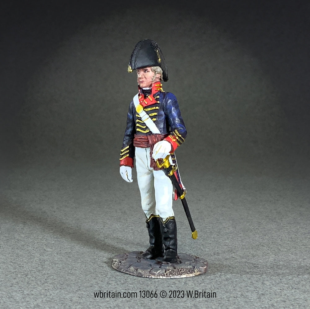 Much more is known about the dress of U.S. Marine officers of this period than of the enlisted men. Although only a few enlisted men were sketched or painted, several excellent officer portraits confirm the written descriptions of the time. Blue full-length coats with red facings and gold trim and buttons were called out in the regulations, but minor variations in the details of decoration were not unusual. Unlike the enlisted men, all of the officer’s dress was privately purchased from tailors, hatters, and suppliers of military ornaments. Although boots were fashionable dress for officers in this period, low quarter shoes would be just as acceptable.