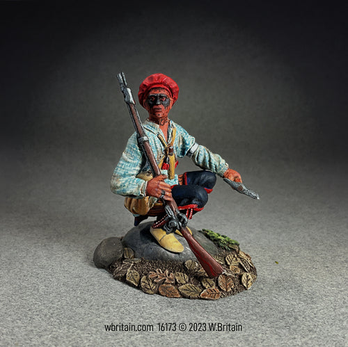 This is an Oneida Indian who is allied with the Patriots during the Saratoga campaign. Records show General Gates issued his Oneida with red woolen caps to differentiate them from British allied Natives. Some, including the Stockbridge Tribe, were also issued new Charleville muskets, shot bags, powder horns, and a few even with cartridge boxes. At the Battle of Oriskany the small contingent of Oneida warriors allied with the Patriot forces, carried themselves with distinction and courage. The American relief column under General Nicholas Herkimer was ambushed near Fort Stanwix, New York by a combined force of Loyalists and Indians. The Americans barely held off the British in one of the bloodiest battles of the American Revolution.