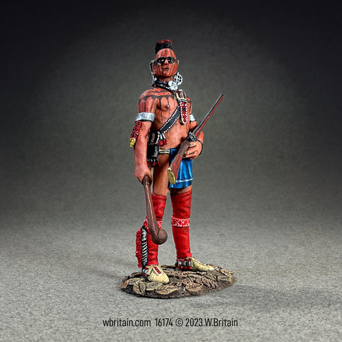 Trade ties originally had the Shawnee allied with Great Britain but in 1754 they sided with the French and were crucial to the successful ambush of Braddock’s Column in 1755. Finally making peace with the British in 1758, a border was established recognizing the limits of British colonization. However, as Anglo-European colonists continued to move westward, the Crown had difficulty enforcing the boundary and now, after suffering defeat in the American War of Independence, had no way of stemming any expansion. Once again, in 1812, the Shawnee sided with the British, and ravaged Ohio and Kentucky farmlands. This Shawnee is in standard fighting dress: usually just a loincloth and leggings, and armed with a short rifle, in addition to the traditional weapon of a hardwood club.