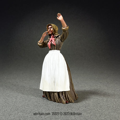 When the American Civil War commenced women had to step into the roles left open by husbands, brothers, and fathers answering the call to arms. With the husbands gone, often never to return, they had to plant and harvest crops, feed animals, and operate farm machinery along with their previous daily work of domestic and familial chores. Their daily uniform was a simple work dress worn without crinoline (hoops skirts), a sturdy apron, and a neckerchief. Hair is worn up and out of the way. Is she calling across the fields beckoning for assistance with the plow, or calling across the hollow to let family know dinner is ready, or to announce that the army has been spotted up the road perhaps led by some great general?