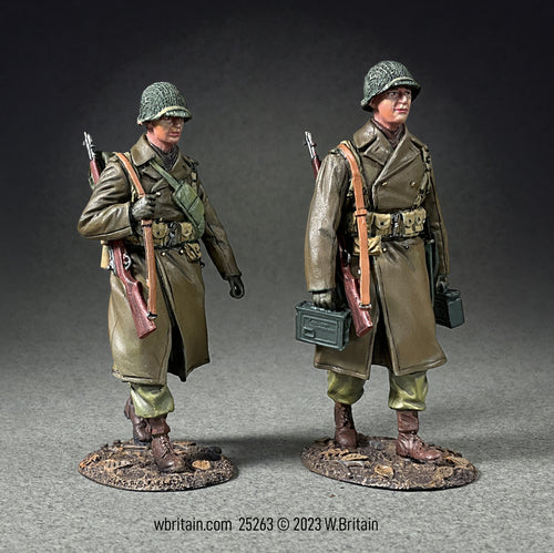 With the introduction of the M1943 field uniform it was thought that the double breasted 32 oz Melton Wool overcoat first introduced in 1927 would be relegated to dress, parade, and furlough wear. However, the failure of the Allies to build up adequate supplies of the new warmer M1943/wool jacket combination forced the army to continue to use the Melton overcoat in front line service. During the German surprise offensive in the Ardennes many soldiers were rushed to the front with inadequate winter clothing, so the availability of the heavy overcoat was welcomed. These two figures could easily represent men from any number of infantry or parachute divisions sent to stop the German attack in the hilly woodlands of Luxembourg and Belgium during the winter of 1944-45.