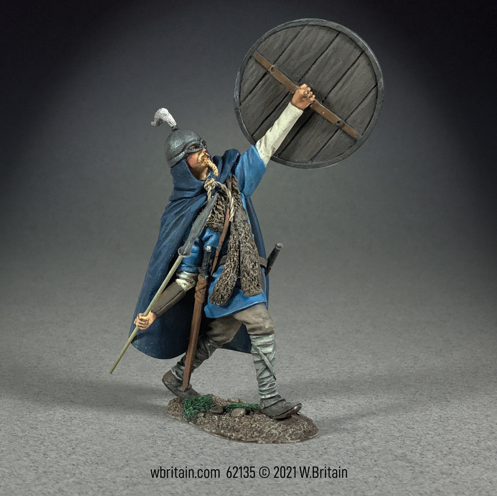 62135 1/30 scale Matte Finish Single figure in box Alfgeir is an Old Norse compound name of Álf- “elf,” which was not a particularly popular Scandinavian name, and -geir, meaning “spear” which was quite popular with Vikings as both a naming convention and an implement of war. This Viking is about to launch his weapon. His back muscles are coiled, his pectorals stretched across his chest. From there an involuntary contraction of the chest muscles brings his throwing arm forward with increased force while the rotation of the shoulders initiates the release. Several spears might be carried into battle. As the warrior closed these were thrown, leaving him free to unsheathe his sword or brandish his axe and commence the melee.