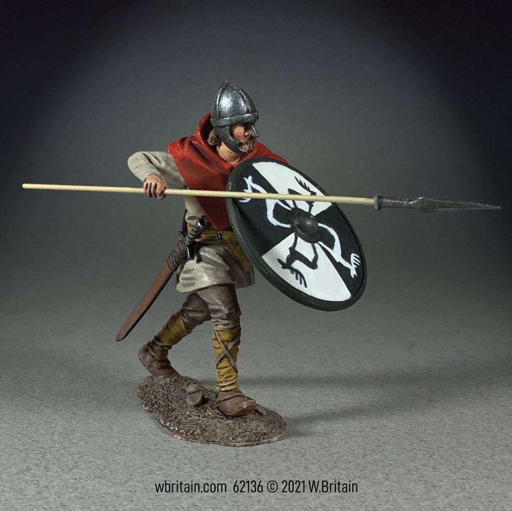 62136 1/30 scale Matte Finish Single figure in box This warrior’s name means “noble spearman.” The most commonly employed weapon on the battlefield was the spear – primarily because of its simple construction. It did not require a lot of iron to create the spearhead, nor was it difficult to find the ash wood to form the shaft. The larger spears, like this one, were called Æsc (from the Saxon word for ash) and were tipped with a wide, leaf-shaped blade. Spearheads