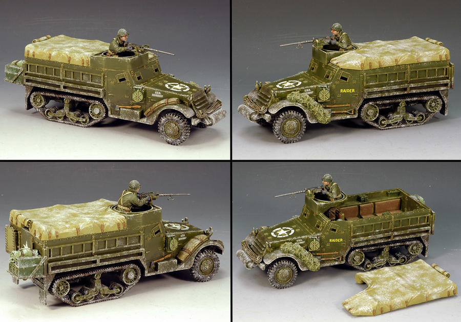 This classic armoured troop transport served U.S. Forces and their Allies loyally throughout the War and even into the late 1970's (with the Israeli Army). Our GI version comes complete with a driver and a standing .50 calibre machine gunner and his crew-served weapon. This winter-version also has a detachable canvas cover for the troop compartment. A towing hook at the rear of his vehicle is also suitable for pulling…