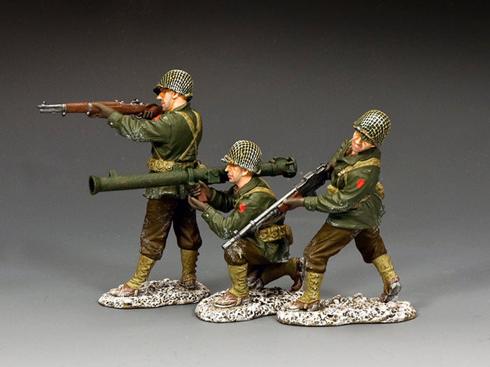 The ‘Bazooka’ is the common name for a man-portable, recoilless anti tank rocket launcher weapon. Developed and widely used by the US Army in WW2, the ‘Bazooka’ was among the first generation of rocket-propelled anti tank projectiles used in infantry combat. Our ‘Bazooka’ GI is protected by two of his buddies, one carrying the B.A.R., the M1918 Browning Automatic Rifle the squad support weapon throughout WW2 and beyond. The other GI is aiming his always reliable M1 ‘Garand’. All of these nine GI ‘winter warriors’ make great additions to our pre released M36 ‘Jackson’ tank destroyer in ‘winter’ camo.