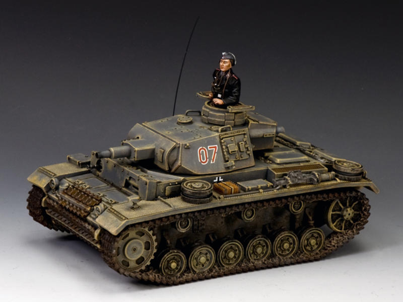 The Panzer III Ausf.N variant was an “assault tank” that was produced to meet the specific need for a stronger tank that could more effectively take on the Soviet T34. Designers decided to use the short-barreled 7.5cm main gun along with a special “hollow-charge” shell. Additional armour was also included in this model, especially around the turret. Production of these “N” variants began in June 1942 and continued through until August ’43. Just over 700 were built in this time. Most being conversions and upgrades from existing Ausf.L. and Ausf. M. tanks. This new version earned a good reputation from its crews and mostly saw action on the Eastern Front. Some models were also transferred from German stocks to Romania, Slovakia and Croatia after their replacement by more updated German armour. Our K&C model is in typical field grey and comes with a tank commander figure.