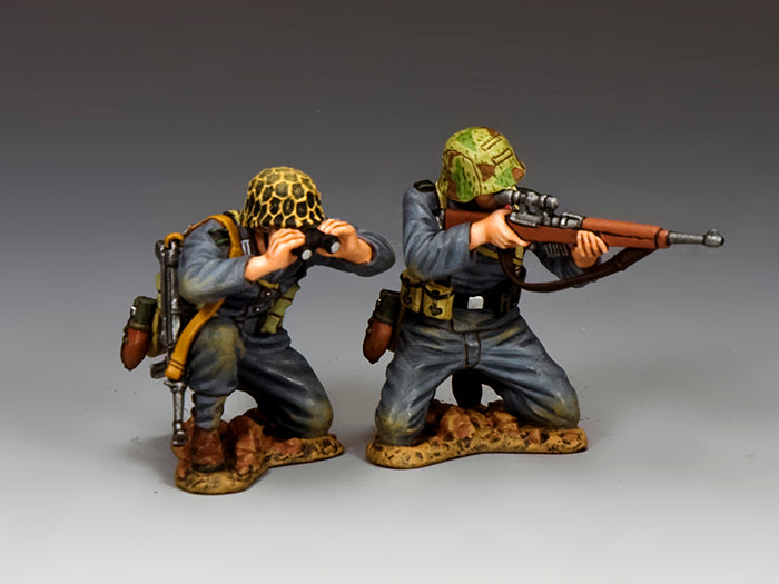 Our sniper here is firing the "Gewehr 43" a semi automatic rifle that owes some of its development to the earlier Soviet 'Tokarev SVT-40'. It fired the same 7.92mm round as the K98 and had a 10-round box magazine. Kneeling alongside our sniper is his 'Spotter' observing the enemy and selecting targets.