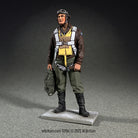 The United States Army Air Forces (U.S.A.A.F. or A.A.F.) was the major land-based aerial warfare service of the United States Army. When established it was composed of 15 permanent combat groups, each organized into three or four flying squadrons. By World War II it held 67 combat groups: 26 were classified as Bombardment; 26 Pursuit groups (renamed fighter group in May 1942); 9 Reconnaissance groups; and 6 Troop Carrier/Combat Cargo groups. This figure represents a U.S.A.A.F. fighter pilot wearing the classic A2 leather flying jacket under his life preserver , and carrying parachute. He appears as he would have pre-flight ready to mount his P-38, P-47, or P-51.