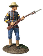 In 1898 the U.S. Marines saw action in Cuba, Puerto Rico, and the Philippines during the Spanish–American War. The successful landings at Guantanamo, and the tenacious fighting at the Battle of Cienfuegos, and in Fajardo during the Puerto Rican Campaign, solidified the Marines’ stature as an elite combat unit. Fifteen Marines would earn the Medal of Honor during the conflict. At the outbreak of war, Marine forces wore their standard blue wool uniforms owing to a shortage of khaki cloth. Equipment consisted of a wide belt with attached x-suspenders and ammunition pouches, all made of black leather; a canteen, haversack, plus bayonet scabbard. Later, a brown linen “campaign suit” was adopted, to be worn in conjunction with the felt campaign hat.