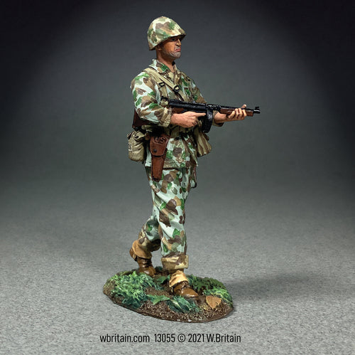 Originally established by the United States Marine Corps during World War II, Raiders were a special operations force and an “elite force within an elite force.” The Marine Raiders battledress was the M1942 Frog Skin pattern, which was reversible with a five-color jungle pattern on one side and a three-color beach pattern on the other. This Leatherneck carries the M1928 Thompson submachine gun with a 100-round drum magazine, a pouch for an additional 5, 20-round stick magazines, and an Automatic Pistol, Caliber .45, M1911A1 on his hip. The Raider battalions were disbanded on 8 January 1944. The changing nature of the war in the Pacific, i.e., large-scale amphibious assaults, negated the need for small light units that could surreptitiously strike deep into enemy territory.