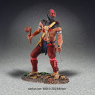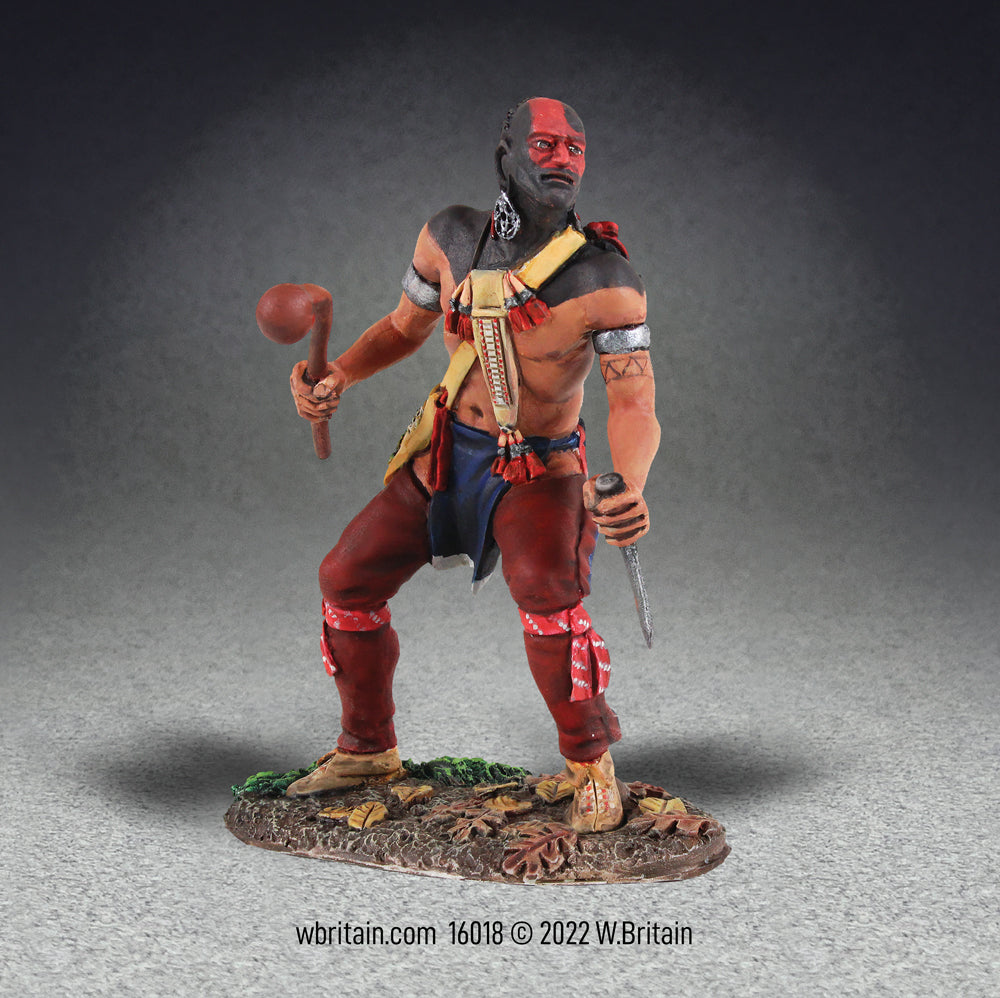 Ball headed clubs were carved from a single piece of hardwood with a long handle and, optimally, a natural burl at the end. A burl results from a tree undergoing some form of stress due to injury or virus resulting in a dense mass with a tight wood grain. Carved into a ball shape, this burl head was extremely strong and resistant to splitting. While the weapon would certainly deliver a devastating blow in close quarters combat, this warrior also brandishes a so-called “scalping knife.” The wooden club predates European colonization, this metal knife does not. These trade knives were certainly formidable in battle but were probably more useful in the day- to-day life of its owner.