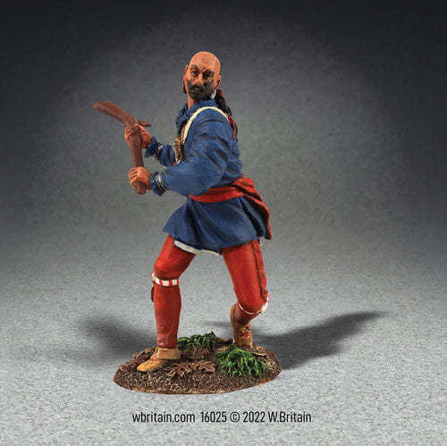 This indigenous weapon was used by many Native American groupings from the Eastern Woodlands to the Central and Northern Plains. It was so named by the Europeans who encountered it because of its similar appearance to the wooden stocks of their own muskets and rifles. In fact there is a dispute as to the origin of the weapon, whether its design was based on the firearms the indigenous warriors encountered – a spent musket could be easily turned around and used as a club if need be – or its design was organic and purely coincidental. Typically weighing two to three pounds and made of straight grain hardwood, its swing force was focused on a small striking edge and could be deadly. The addition of a spear point of flint, horn, or iron increased its lethality.