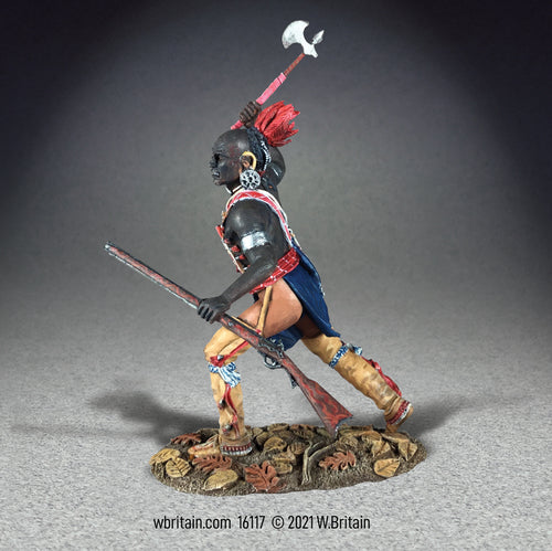 The single-handed axe the indigenous peoples of North America used for millennia was bladed with sharpened stone or deer antler. Spanish traders introduced “Biscayne” axes (so named as they were made from iron mined in the Bay of Biscay region) to North America in the mid-1500s. These axes were made entirely for trade – there was little use for small hatchets in Europe as their deployment in land battle had long elapsed by that time. Probably the most common trade axe was the Hudson’s Bay style which was originally based on a Royal Navy boarding axe. These axes would often be personalized with elaborate decorations of brass tacks and quill by their owners. This warrior is wielding a type of Halbert tomahawk, likely acquired from a Scottish regiment staff sergeant's pole arm, and shortened. He represents the improved weaponry from the clash of empires.