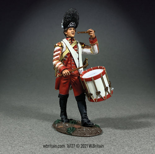 During the 18th century British infantry regiments were identified by the color of the facings (collar, cuffs, and lapels) of their coats, and numbers or designs on their flags and drums. In addition the facings were often decorated with false buttonholes made of woven woolen tape (lace) in various widths. Lace patterns were specific to the regiment and could be in white, yellow, or white with a series of colored lines. To further complicate things, the drummers and fifers of line regiments, which often exceeded 20 men, wore reversed colors to set them apart from the regular soldiers. Thus, a drummer of the 43rd Regiment would wear a white coat with red facings rather than the red coat with white facings of the rest of the regiment.