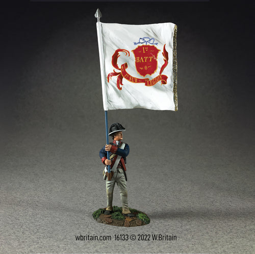Very few early American military flags survive today. Silk was the preferred material for flags in 18th and 19th century, and silk simply degrades becoming brittle, thus easily damaged beyond repair. In many cases the only parts of early silk flags that survive are areas that have been painted with a design, the oil paint creating a protective surface encased by the linseed oil and pigments. One rare surviving flag now in the collection of the U.S. Military Academy at West Point New York is the white silk flag of the 3rd Battalion of the 1st Sub-Legion which descended in the family of Colonel Hamtramck after 1793.