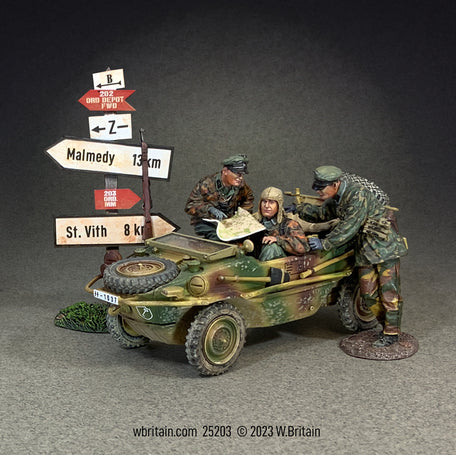 This set is based on one of the most recognizable images of the war. It was taken from the German newsreels during the failed German offensive in the Ardennes, December 1944. The offensive known as Unternehmen Wacht am Rhein (“Operation Watch on the Rhine”) was launched and vehicles passing at the Kaiserbaracke Crossroads between St. Vith and Malmedy, were filmed by by Propagandakompanie or PK cameramen. These are the men of the 3rd Kompanie SS-Panzer-Aufklärungs-Abteilung (Reconnaissance Unit), Kampfgruppe Knittel posed walking and reading maps in front of the signpost. The German’s initial attack involved 410,000 men and by the end of the offensive between 63,222 and 98,000 of these men were killed, missing, wounded in action, or captured.