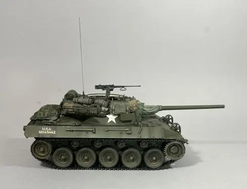 The vehicle that came to be known as the M18 was the result of a convoluted development process that began in fall, 1941. At that time U.S. Army doctrine held that a force of dedicated tank destroyers would thwart enemy armored assaults. General Lesly McNair, head of Army Ground Forces, decreed that half of these antitank forces be towed weapons, contrary to the wishes of the head of the Tank Destroyer Center, Colonel A.D.Bruce, who advocated heavily armed, very fast, self-propelled tank destroyers. In early 1943, the 76mm Gun Motor Carriage T70, was standardized as the M18. Buick, the builder of the vehicles, dubbed the new tank destroyer the Hell-Cat (notice the hyphen). The Hell-Cat first saw combat at Anzio, Italy, and from there use of the vehicle spread throughout the European campaign. While designed and built to be a tank destroyer, units in the field frequently pressed the vehicles into service as direct-support artillery for infantry. At their peak, in March 1945, there were 540 M18s in use in Europe. Those Hell-Cats are credited with the destruction of 526 enemy armored vehicles, at a cost of 216 of their own.