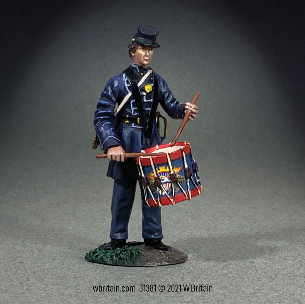 31381 1/30 Scale Matte Finish Single Figure Like a regiment’s standard, the drum was an important symbol to its corps. They were often decorated with the unit’s insignia, coats of arms, or national symbols. In the late 18th century the National Eagle became ubiquitous and was emblazoned on everything from banners to buttons and was also affixed to military drums. The drums became known as “eagle drums” and in the 1840s, the United States Army attempted to standardize these decorations. Brilliant colors were used to render the device: the raptor and its shield, which was then ringed by stars on a blue field, and finally capped by a sunburst. Eagle drums were especially popular with the Union Army during the Civil War.