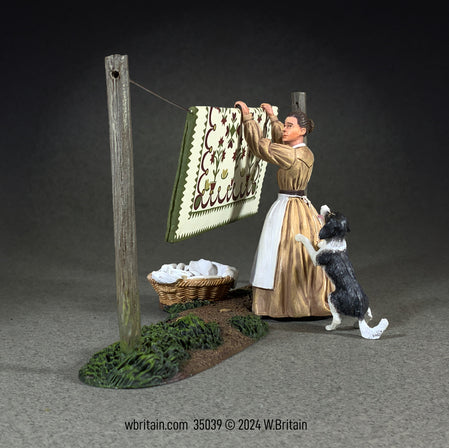 35039 - “You Are Really Not Helping!” Woman Hanging Quilt with Playful Dog, 1855-68