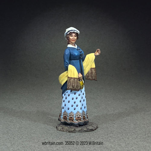 Jane Austen described the character Mrs. Bennet in her novel Pride and Prejudice as a “woman of mean understanding, little information, and uncertain temper. When she was discontented, she fancied herself nervous. The business of her life was to get her daughters married: its solace was visiting and news.” Mrs. Bennet is a pretty savage caricature and her role in the story is mainly one of comic relief. She is portrayed as a small-minded, vulgar woman with no self-awareness or tact. While the character of Mrs. Bennet was lacking in decorum, she was aware of the importance of fashion on one’s standing in society. To that end she sports a fashionable, high empire waistline, a must-have paisley shawl, and a delicately beaded reticule handbag.