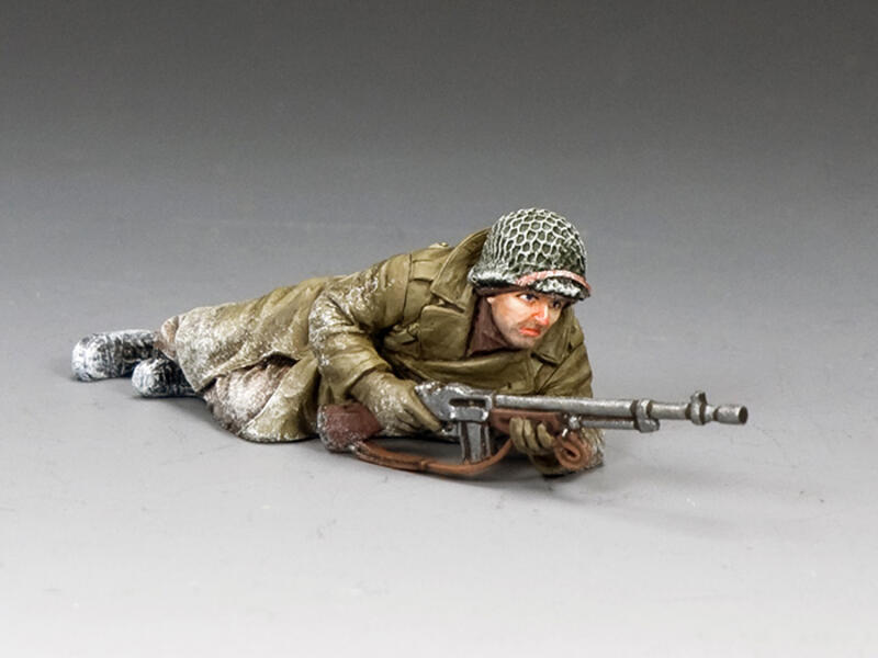 Although, strictly speaking, the B.A.R. (Browning Automatic Rifle) was not a machine gun it was employed mostly in the light machine gun role within American WW2 Infantry Squads. Each American infantry squad (usually 8-10 men) would always contain at least one soldier carrying the B.A.R. Both the M1 ‘Garand’ Rifle and B.A.R. used the same .30 cal. ammunition. K&C’s new B.A.R. Gunner is taking cover as he observes the enemy.