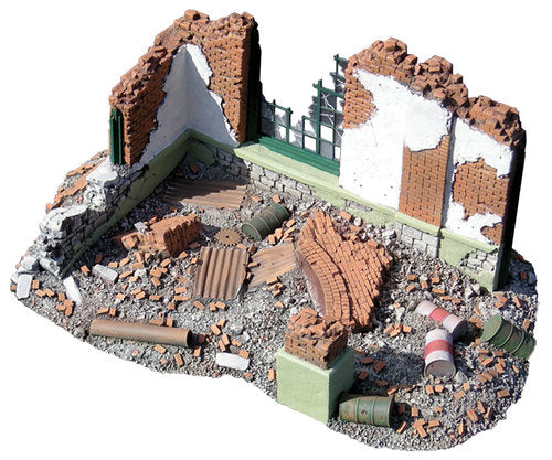 Useful for war torn environments this piece can be blended into scenery with loose material such as sand or gravel. Lightweight and easy to arrange for realistic displays, this damaged building component is hand-made and hand-painted in the USA.