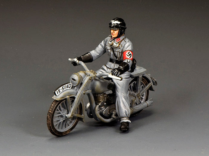 The NSKK (German: Nationalsozialistische Kraftfahrkorps) was the paramilitary National Socialist Motor Corps that existed from 1931 to 1945. The NSKK served as a training organization for young people wanting to learn how to operate and maintain high performance motorcycles and automobiles. The NSKK was also used to transport Nazi Party members and officials all over Germany before 1939. With the outbreak of war in September 1939 most of its members were mobilized into the Wehrmacht and Waffen SS as drivers, mechanics, instructors and dispatch riders. Our prewar NSKK rider is dressed in their distinctive grey uniform and wearing their own special style and design of ‘crash’ helmet.