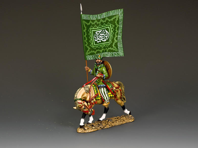 This large green and white banner carries a quotation from the Koran surrounded by a delicate and intricate mix of Middle Eastern Islamic designs and motifs. Together with the mounted warrior it makes a striking centerpiece of any Saracen collection!