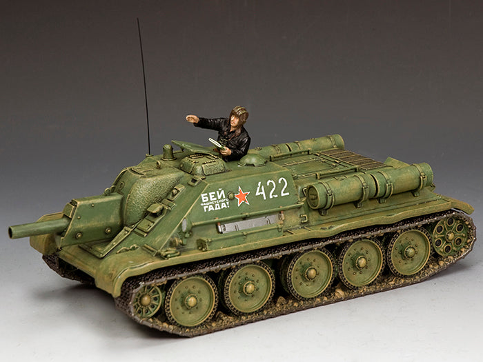 The SU-122 (Samokhodnaya Ustanovka 122mm) was a Russian-made, self-propelled howitzer or assault gun during WW2. The number ‘122’ refers to the caliber of the main armament – a 122mm M-30S howitzer. The vehicle chassis was the same as the famous T34 tank. Design and Production began in 1942 and continued until the summer of 1944. By then a total of 1150 vehicles were produced. Our K&C model is in typical Soviet markings and colour scheme of the mid war period complete with patriotic slogan “Kill The Fascists” and comes with a tank commander figure.