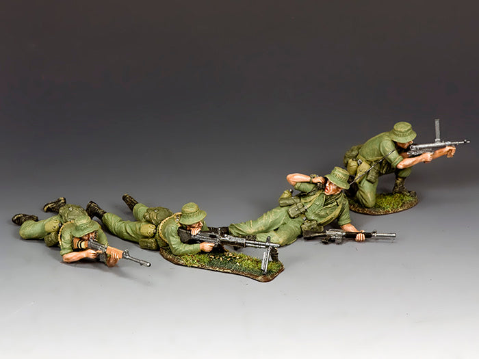 A kneeling NCO (non commissioned officer) kneels and opens fire with his Australian-made Owen Submachine Gun. Backing him up are two lying prone soldiers... one fires the American M60, belt-fed machine gun while the other utilizes the standard L1A1 SLR (self loading rifle). The fourth member of the section is the radio man holding his M16 rifle in one hand while he calls in a SITREP (situation report) on the handset of his PRC-25 radio set.