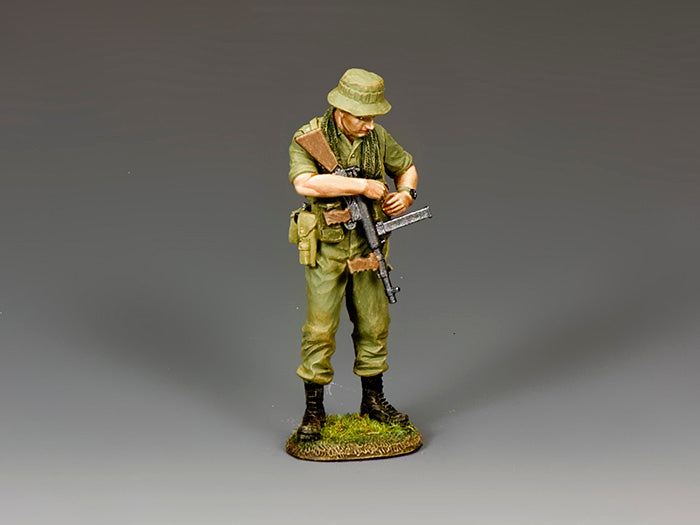 This Australian officer is armed with the ‘Owen Gun’, an Aussie-designed weapon first developed back in 1939. The ‘Owen Machine Carbine’ was the only entirely Australian- designed and constructed submachinegun of WW2. It came into service in 1942 and continued until the mid 1960’s. It’s unusual appearance included the top-mounted magazine and a side-mounted sight however in combat the Owen proved reliable and sturdy. This particular figure is the ‘Show Special’ created for the Annual K&C Oz Visit down to Australia. A limited number of this figure are also available to worldwide dealers and collectors.