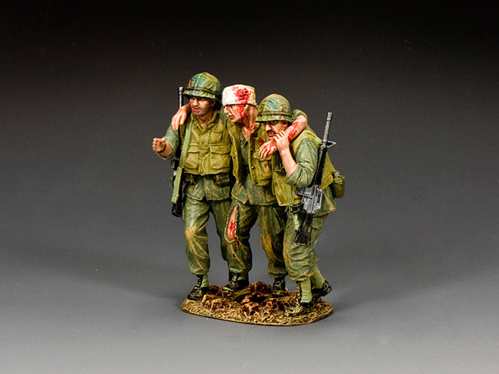 Many of the figures in the Vietnam Series have been directly influenced by actual combat photography taken under fire in some of the most dangerous situations. This dramatic three-figure set was inspired by one such photo taken in the midst of the Battle of Hue in February 1968 during the TET Offensive. Two Marines support a seriously wounded ‘Grunt’ as they make their way back to a First Aid station.