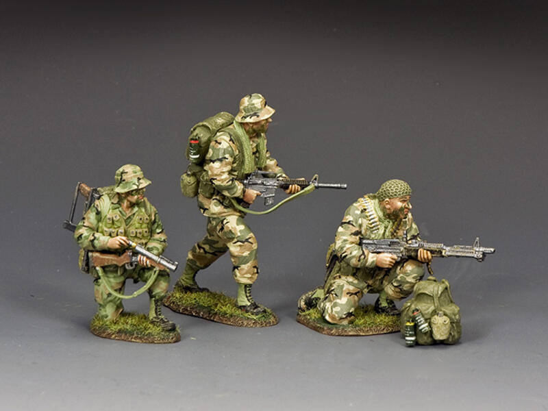 This trio of Special Forces soldiers are ‘armed and very dangerous’! The ‘Team Leader’ moves cautiously forward carrying an M16A2 Assault Rifle, an updated and upgraded version of the standard U.S. Army M16A1, usually only distributed to Special Forces. He is dressed, in the then new ERDL* Pattern camouflage which was only issued to elite reconnaissance and special operations units in early 1967. *Engineer Research & Development Laboratories, a branch of the U.S. Army. The kneeling ‘Grenadier’ is loading his M79 Grenade Launcher, backing this up is his personal weapon, a ‘Swedish K’, 9mm submachinegun. Completing the ‘trio’ is the heavy firepower of the crouching M60 machine gunner festooned with belts of 7.62mm ammunition. He also carries the M1911 Colt Automatic Pistol alongside his ‘K bar’ fighting knife. His backpack sits in front of him. These last two S.F. troopers are also wearing the newly-introduced ‘ERDL Camo’ suits.