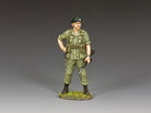 This senior officer is wearing the classic ‘green beret’ which began to be worn by some U.S. Special Forces as early as 1954 but was not officially authorized until 1961. This first version of our S.F. colonel is wearing standard issue ‘jungle fatigues’, the tropical combat uniform worn by all US forces in Vietnam. The colonel’s name and ‘U.S. Army’ tapes were sewn atop the breast pockets of this jacket. On his left shoulder are the ‘airborne’ patch over the Special Forces’ sleeve shield insignia. In his left hand he also carries the standard M16 rifle.