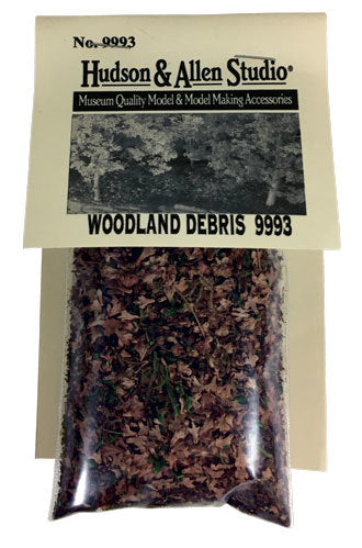 Hudson & Allen Studio’s “WOODLAND DEBRIS” is a mixture of various natural and synthetic materials, which can be used to model the dead leaves and forest detritus found on forest floors. Modeling realistic ground cover for woodlands or other leaf-covered areas has always been a difficult prospect. This product evolved from experience as museum exhibit builders has been refined over a period of years. It is now available to you to use anywhere you wish to simulate realistic ground cover in a woodland setting. WOODLAND DEBRIS comes ready to use and requires no painting or dying. WOODLAND DEBRIS can be used loose to cover bases of figures or it can be permanently affixed to your scenic base. To permanently fix in place simply apply a small amount of white glue to the area of your model where you wish to place the debris. While the glue is still wet, sprinkle the WOODLAND DEBRIS over the glue and allow to dry. It may be necessary to spray more diluted glue over the debris to anchor loose particles. You may wish to arrange the debris so the larger leaf-like particles are at the top. When completely dry, you may wish to seal the WOODLAND DEBRIS with a flat, clear sealer.